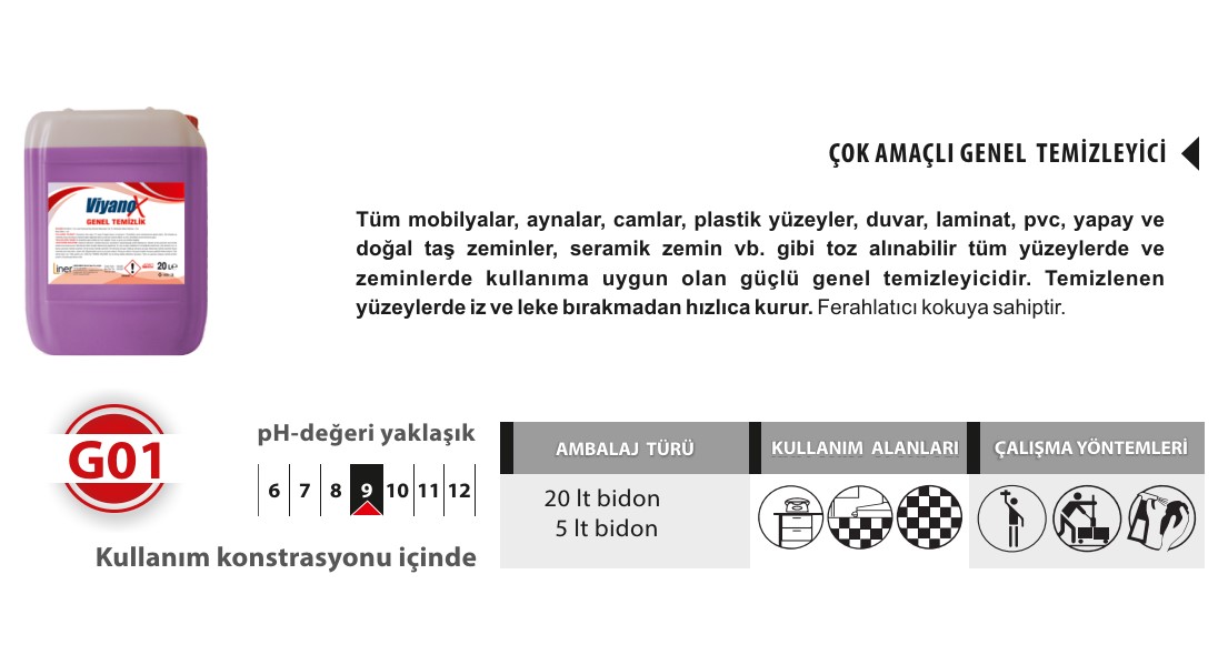Tüm mobilyalar, aynalar, camlar, plastik yüzeyler, duvar, laminat, pvc, doğal ve yapay taşlar, seramik zemin vb. gibi toz alınabilir tüm yüzeylerde ve zeminlerde kullanılmaya uygun olan güçlü genel temizleyicidir.